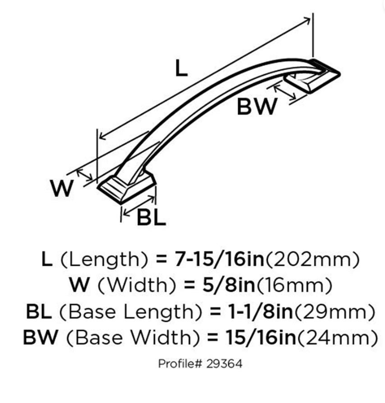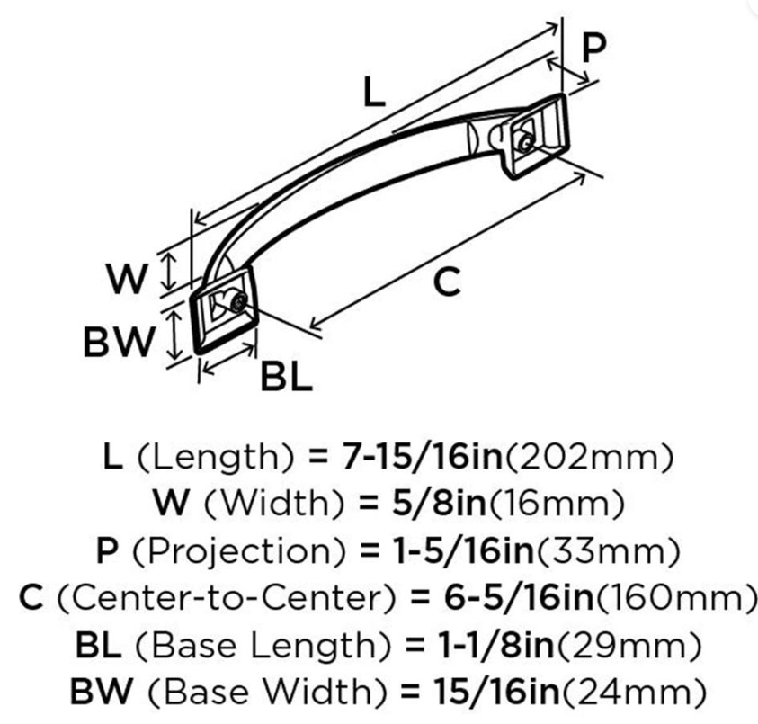 OriginalRetail Price USD 12 / unitNew,never used, never installed. Highly discounted due to slightly damagedpackaging.Description:With strong lines and soft curves, the Candler collection offers a casual feel that imparts timeless character.The Amerock BP29364BBZ Candler 6-5/16 inch (160mm) Center-to-Center Pull is finished in Golden Champagne.Transitional style adds an easy designer upgrade to any cabinet drawer, cabinet door or furniture pieceHigh quality zinc construction for lifelong durabilityMounting hardware included for quick and easy installationCoordinates seamlessly with finishes from popular plumbing and lighting brandsComplete with limited lifetime warranty against defect in material and craftsmanshipSpecifications:Item TypePULLCenter-to-Center Fraction (in)6-5/16Center-to-Center (mm)160Product Length Fraction (in)7-15/16Product Length (mm)202Product Width Fraction (in)15/16Product Width (mm)24Product Projection Fraction (in)1-5/16Product Projection (mm)33Base Length Fraction (in)1 1/8Base Length (mm)29Base Width Fraction (in)15/16Base Width (mm)24Product Weight (lbs)0.22Included Hardware#8-32 x 1in & #8-32 x 1-1/2in Truss Head Machine ScrewsBase MaterialZincOriginalRetail Price USD 12 / unit