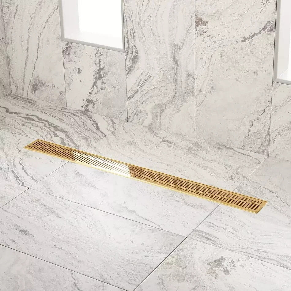 OriginalRetail Price USD 319New,never used, never installed. Highly discounted due to slightly damagedpackaging.Description:Give your bathroom a stylish update with the Rowland Linear Shower Drain. Available in a variety of finishes and sizes, this stainless steel product is resistant to rust and corrosion.Tapered bottom outlet and removable grate.Drain hole measures 2" diameter.Product is made of 304 stainless steel.Features a removable hair strainer basket.FeaturesProduct TypeShower DrainsConfigurationYesProduct FinishPolished BrassMaterialStainless SteelWeight (lbs)6.3DimensionsFits Drain Hole Size3"Height3"Length36"Width3-3/8"OriginalRetail Price USD 319