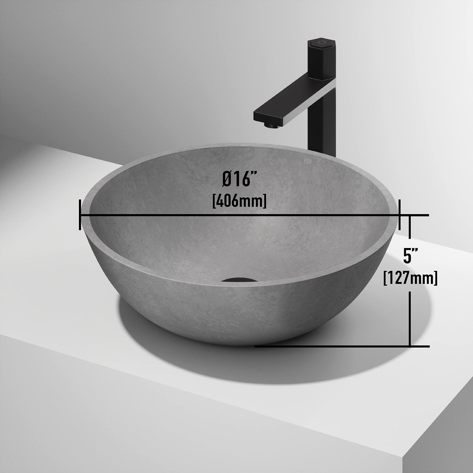 VIGO presents a round bathroom vessel sink handcrafted from Concreto Stone, a mixture of concrete and naturally sustainable materials, this sink is more durable and longer-lasting than traditional sink materials. Its cylindrical shape complement any bathroom vessel faucet, wall mount faucet, and countertop. The Concreto Stone Collection is ideal for traditional, transitional, and modern bathrooms. Vigo Vg04066 Features: Constructed of concrete Coordinates with products from the Ravenna Gothic line Vessel installation Center drain location provides optimal draining capability Complies with ADA standards Vigo Vg04066 Specifications: Overall Length: 16" (left to right of sink) Overall Width: 16" (front to back of sink) Overall Height: 5" (top to bottom of sink) Basin Length: 15" (left to right of basin) Basin Width: 15" (front to back of basin) Basin Depth: 4" (top to bottom of basin) Drain Connection Size: 1-3/4" Number of Faucet Holes: 0